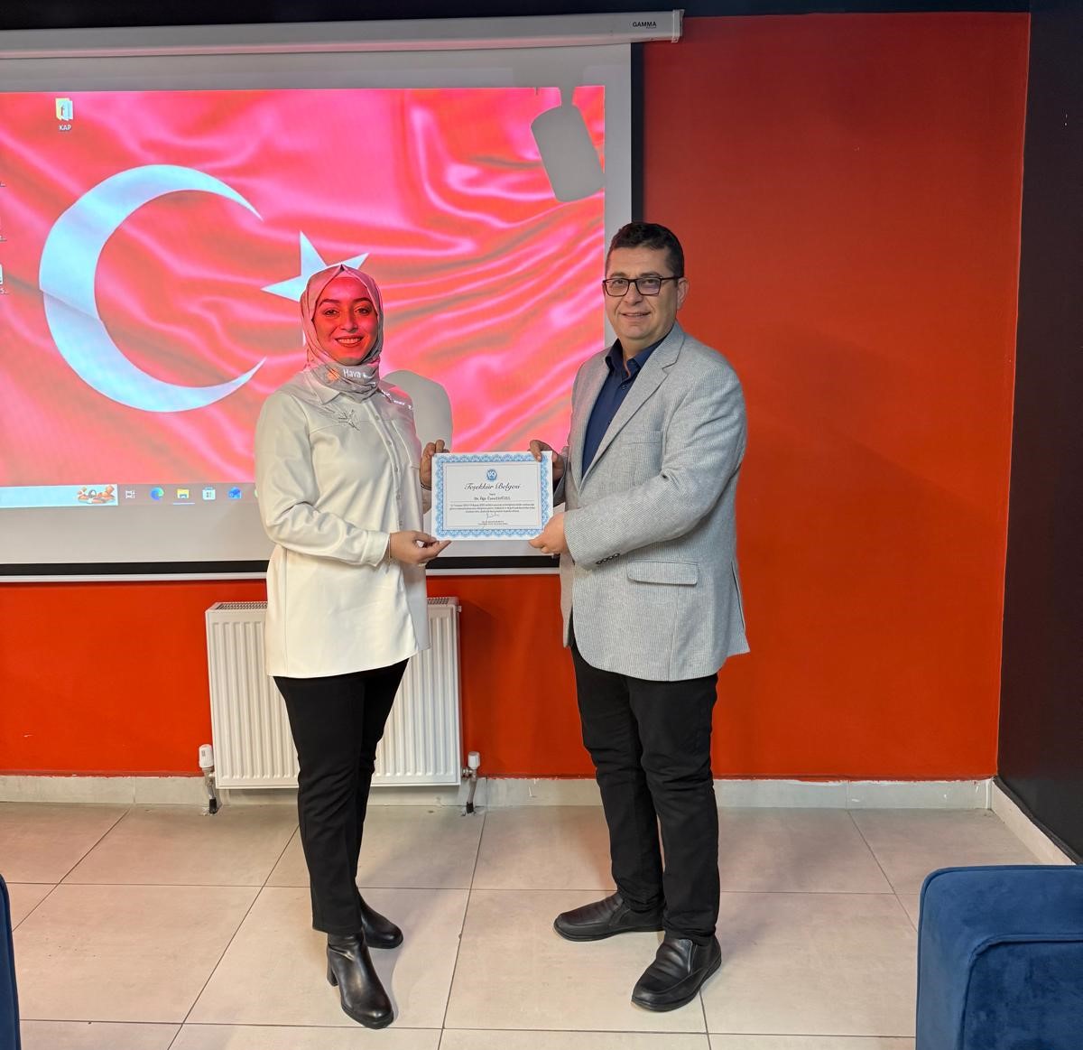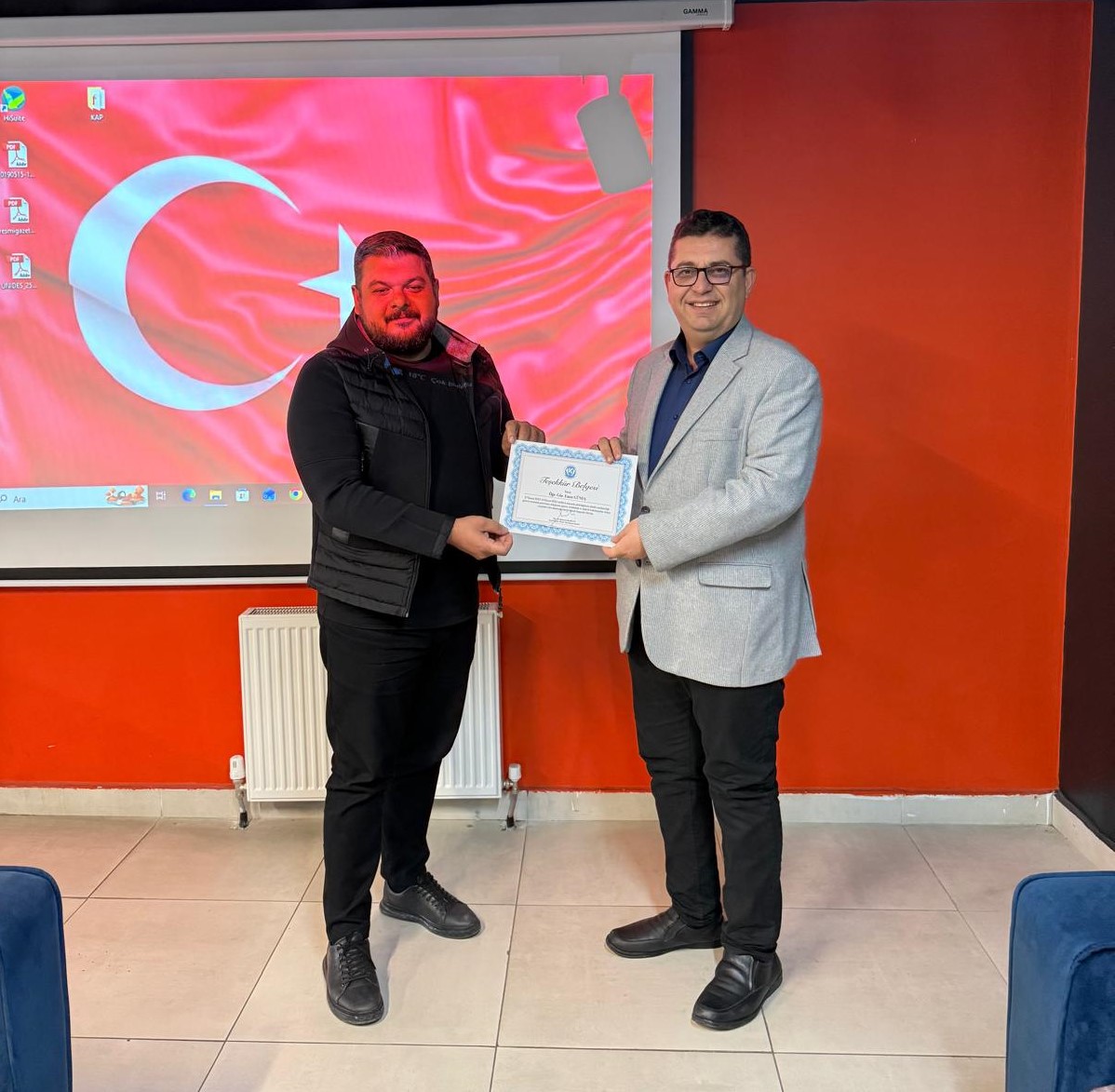 Sosyal Bilimler Meslek Yüksekokulu Müdür Yardımcılığı görevini yürüttükleri süre boyunca göstermiş oldukları gayretli ve özverili çalışmalarından dolayı Dr. Öğr. Üyesi Elif UZEL ve Öğr. Gör. Emre GÜNEŞ’e teşekkür belgesi, Müdürümüz Doç. Dr. Rıdvan Karabulut tarafından takdim edilmiştir.