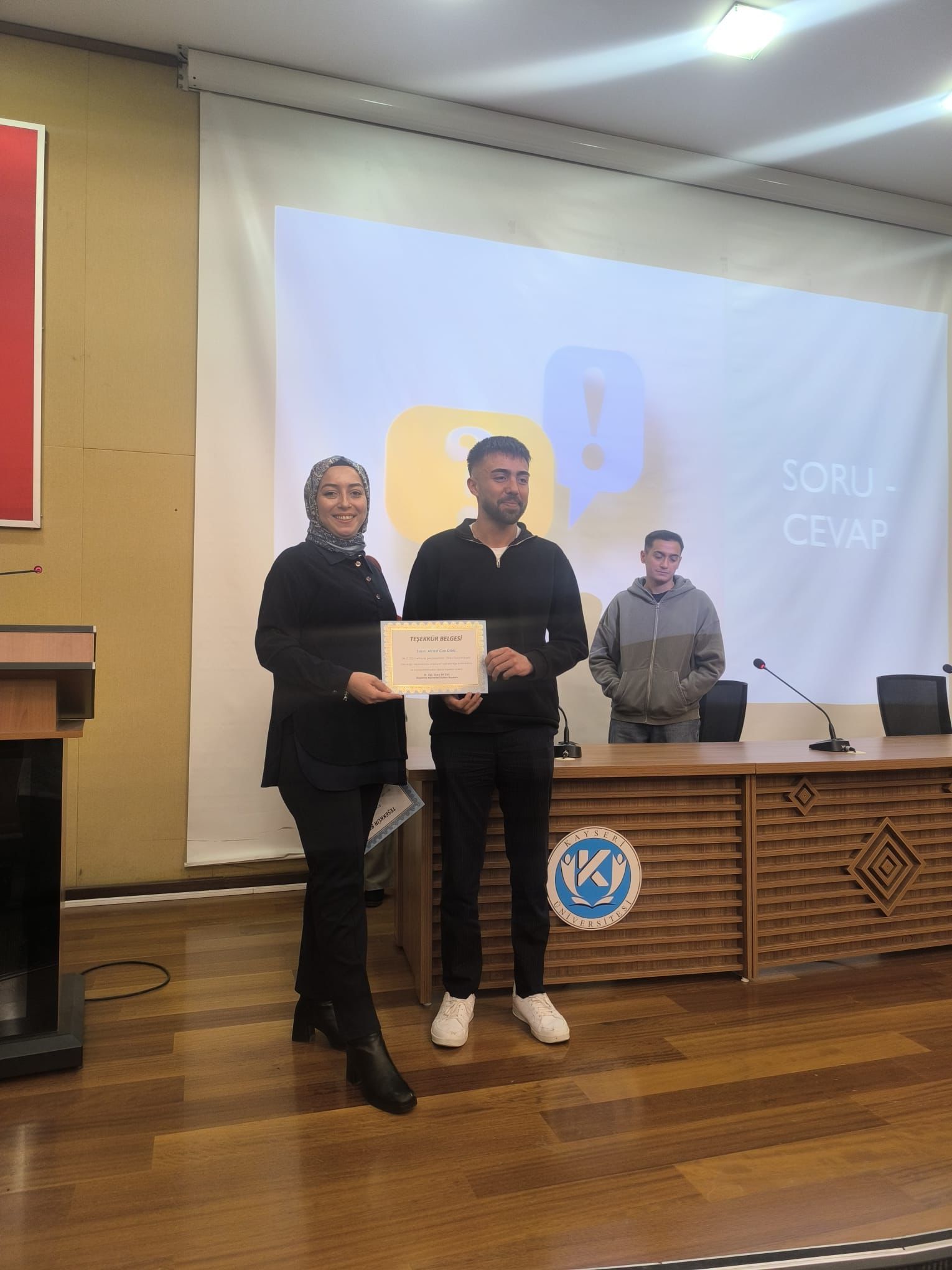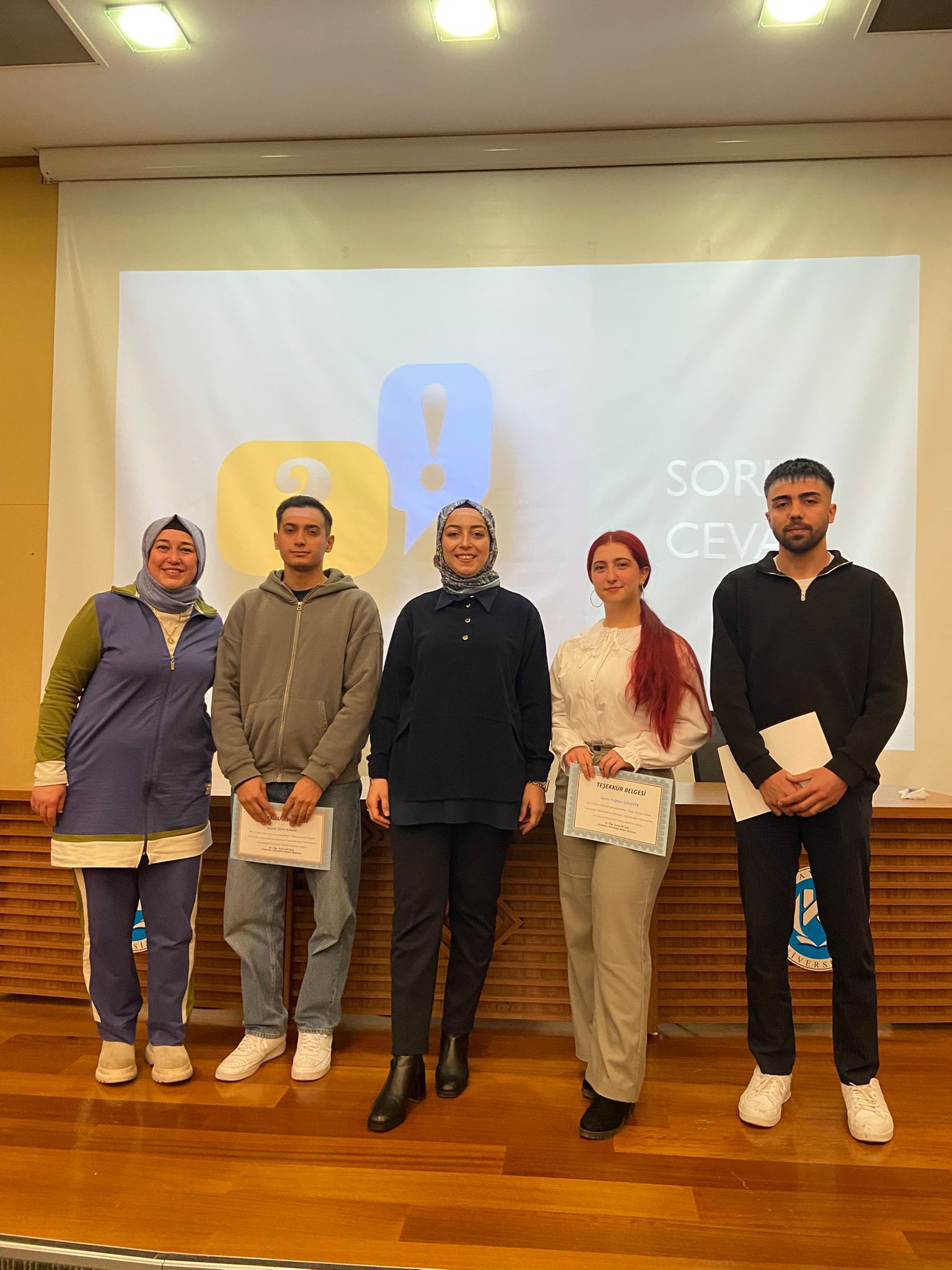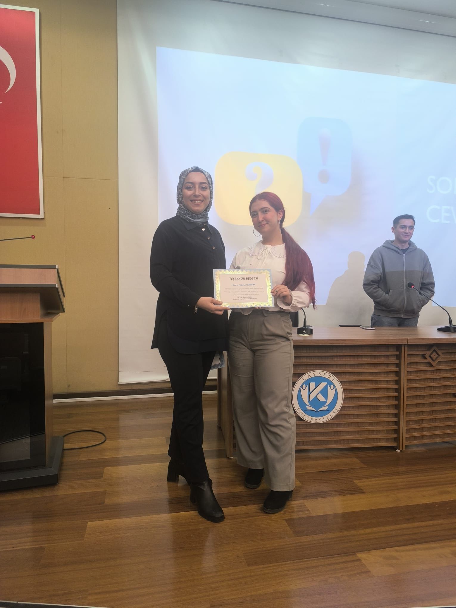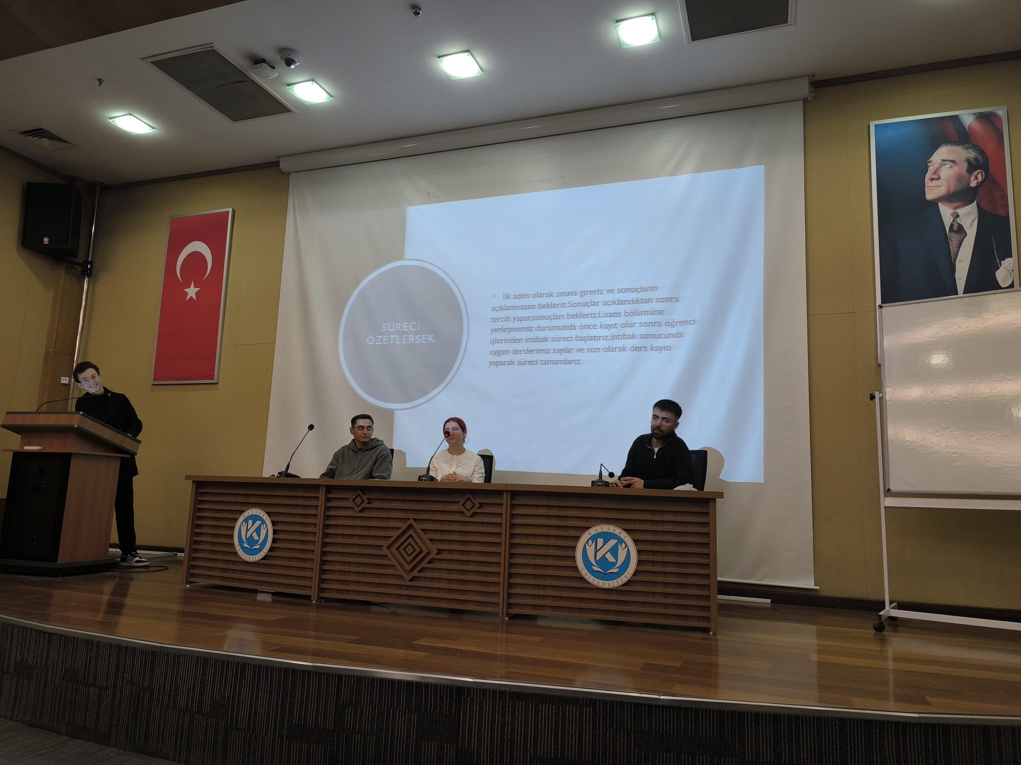 08.12.2025 tarihinde Ulaştırma Hizmetleri Bölüm Başkanı Dr. Öğr. Üyesi Elif ÜZEL ve Öğr. Gör. Seda ÇOLAK'ın katkılarıyla hazırlanan "Dikey Geçişte Başarı Yolculuğu: Mezunlarımız Anlatıyor" konulu etkinlikte DGS ile ERÜ Havacılık Yönetimi bölümünü kazanan öğrencilerimiz Ahmet Can ÜNAL, Yağmur GÜLSEVER ve Sami KABAK tecrübe paylaşımında bulunmuşlardır. Soru cevap ile desteklenen etkinliğin hem 1. sınıf hem de 2. sınıf öğrencilerine fayda sağladığı gözlemlenmiştir.