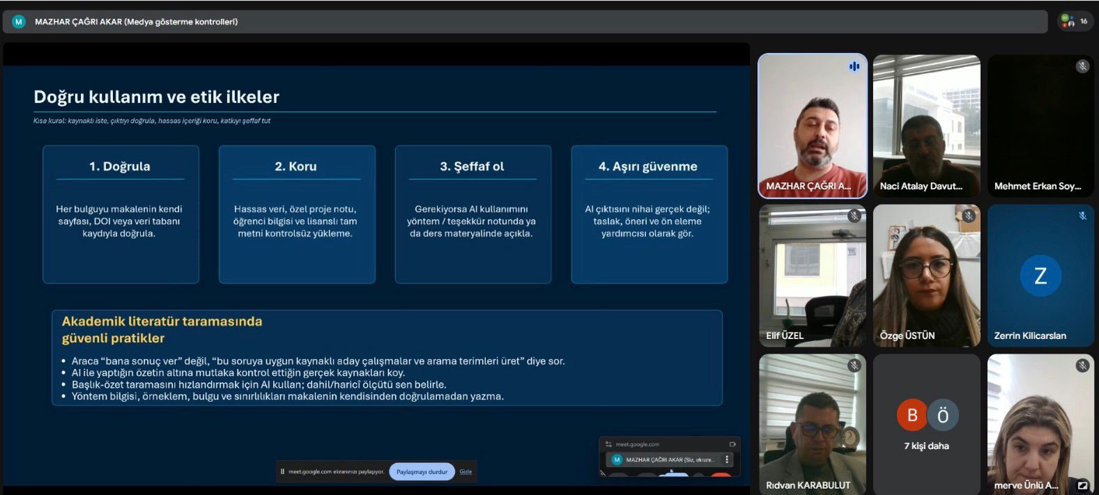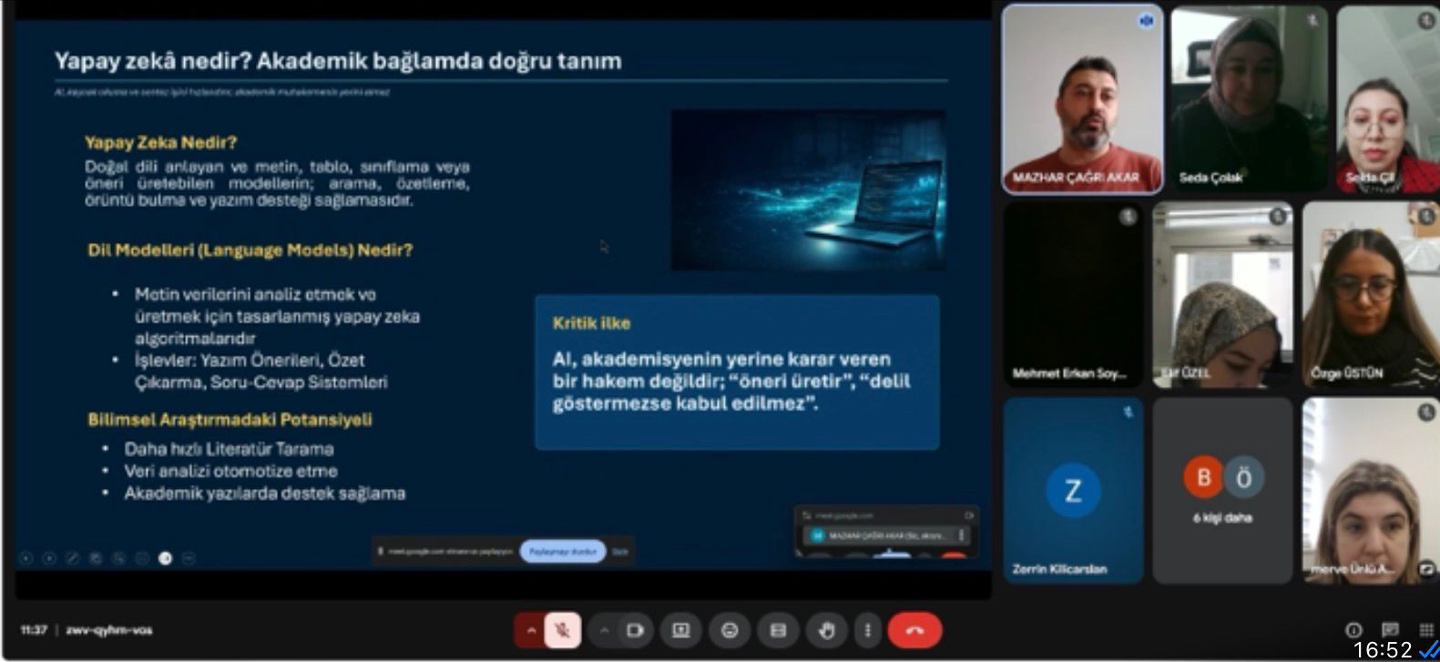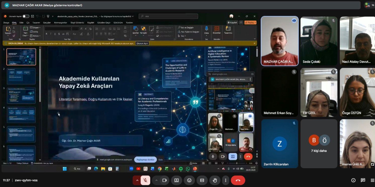 Eğiticilerin eğitimi kapsamında, Meslek Yüksekokulumuz bünyesinde görev yapan akademik personele yönelik ‘Akademide Yapay Zekâ Araçlarının Kullanımı’ konulu hizmet içi eğitim programı, Meslek Yüksekokulumuz öğretim elemanı Öğr.Gör.Dr. Mazhar Çağrı AKAR tarafından başarıyla gerçekleştirilmiştir.
